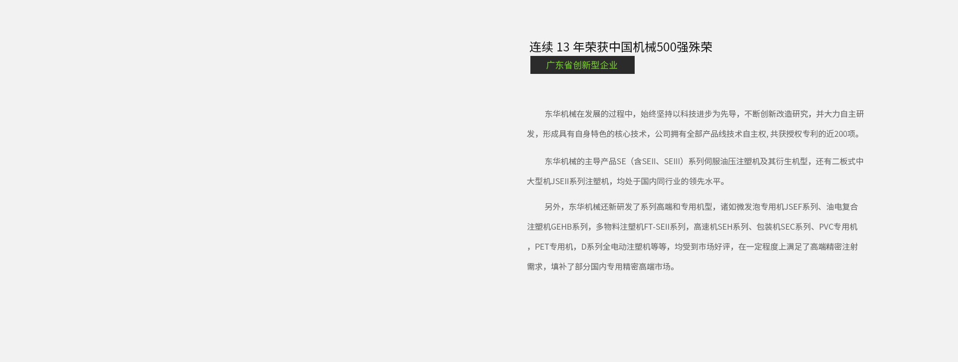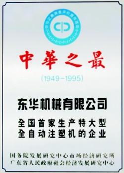 1993年東華公司在國內首先突破特大型注塑機的設計和工藝技術,成功設計制造出國內首臺2500噸合模力的TTI-2500B特大型注塑機,填補了我國大型注塑機的空白,獲得了國務院頒發的“中華之最”榮譽證書;同年在國內塑機行業首家獲得高新技術企業認定證書和ISO9001質量體系認證證書; 2001年研制出國內第一臺環保節能高效的電動注塑機;2004年,被廣東省科技廳評為優秀高新技術企業。